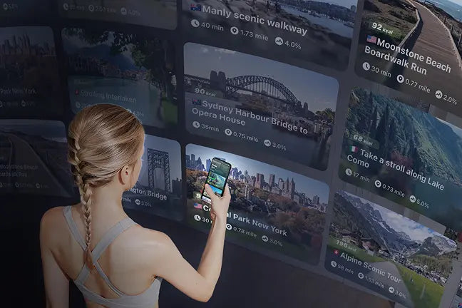 Immersive Home Hiking: World Tour & smart speed and incline adjustment, providing a fully immersive home hiking exercise.