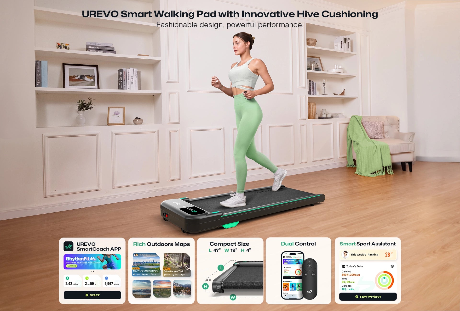 - Smart Sports Assistant: Stay motivated and achieve your fitness goals with UREVO's smart walking pad. Easily customize your walking pad workout through the app, and track your progress with ease. Whether you're power walking or light jogging, the app ensures you stay on track and make the most of every session.