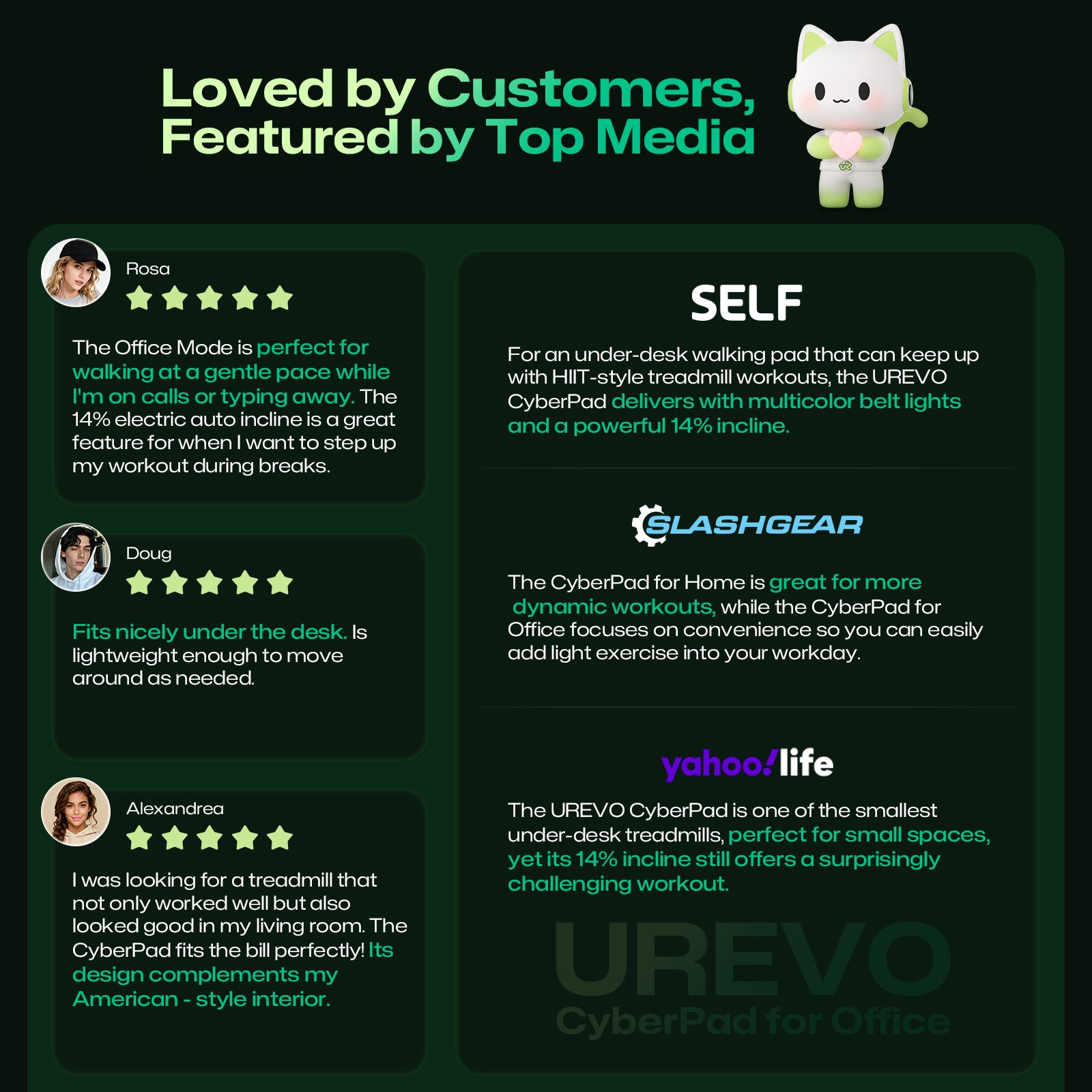 10× Longer Life, Whisper Quiet: Featuring a dual brushless motor system, this walking pad delivers true commercial-grade 2.5HP power - double the output of standard home models. Through extensive UREVO laboratory testing, we've achieved whisper-quiet 35dB operation that won't disturb housemates or neighbors.
