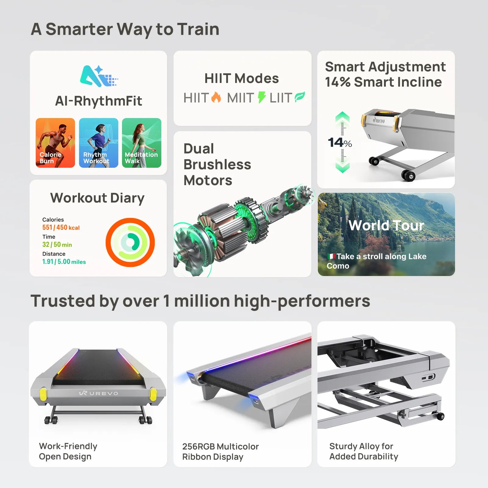 UREVO Wellness Hub: Monitor real-time metrics (time/distance/calories) while tracking long-term trends (weekly/monthly/annual) for complete fitness visibility.