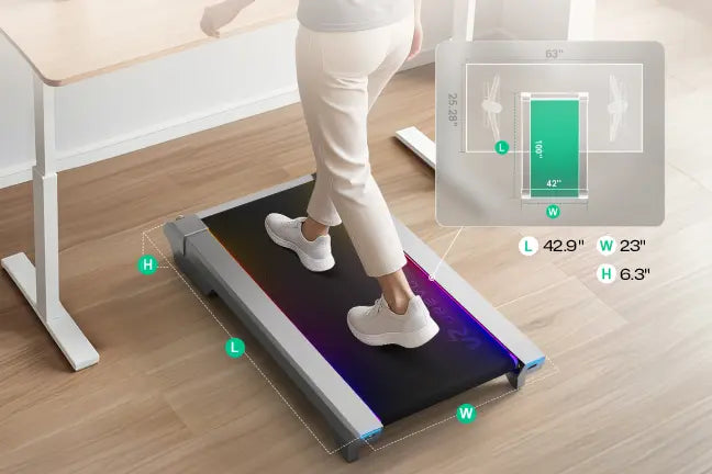Open-Front Design for Working Spaces: Walk during calls, stretch between emails—all on your 6.4-inch ultra-slim treadmill that vanishes under any desk. The industry's lowest profile with 39.4-inch of safe walking space, letting you move naturally without leaving your workspace.