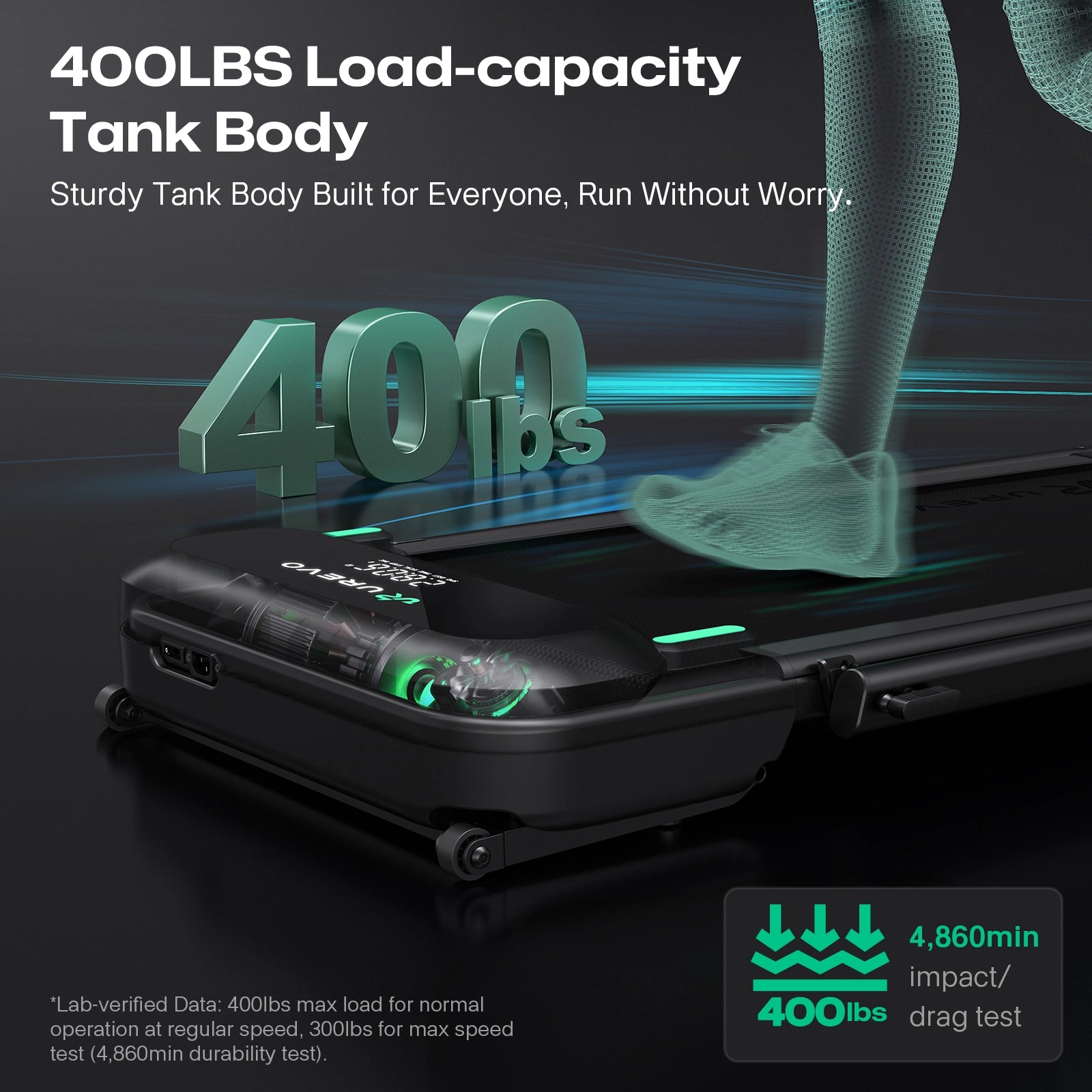 *Lab-verified Data: 400lbs max load for normal operation at regular speed, 300lbs for max speed test (4,860mins durability test).
