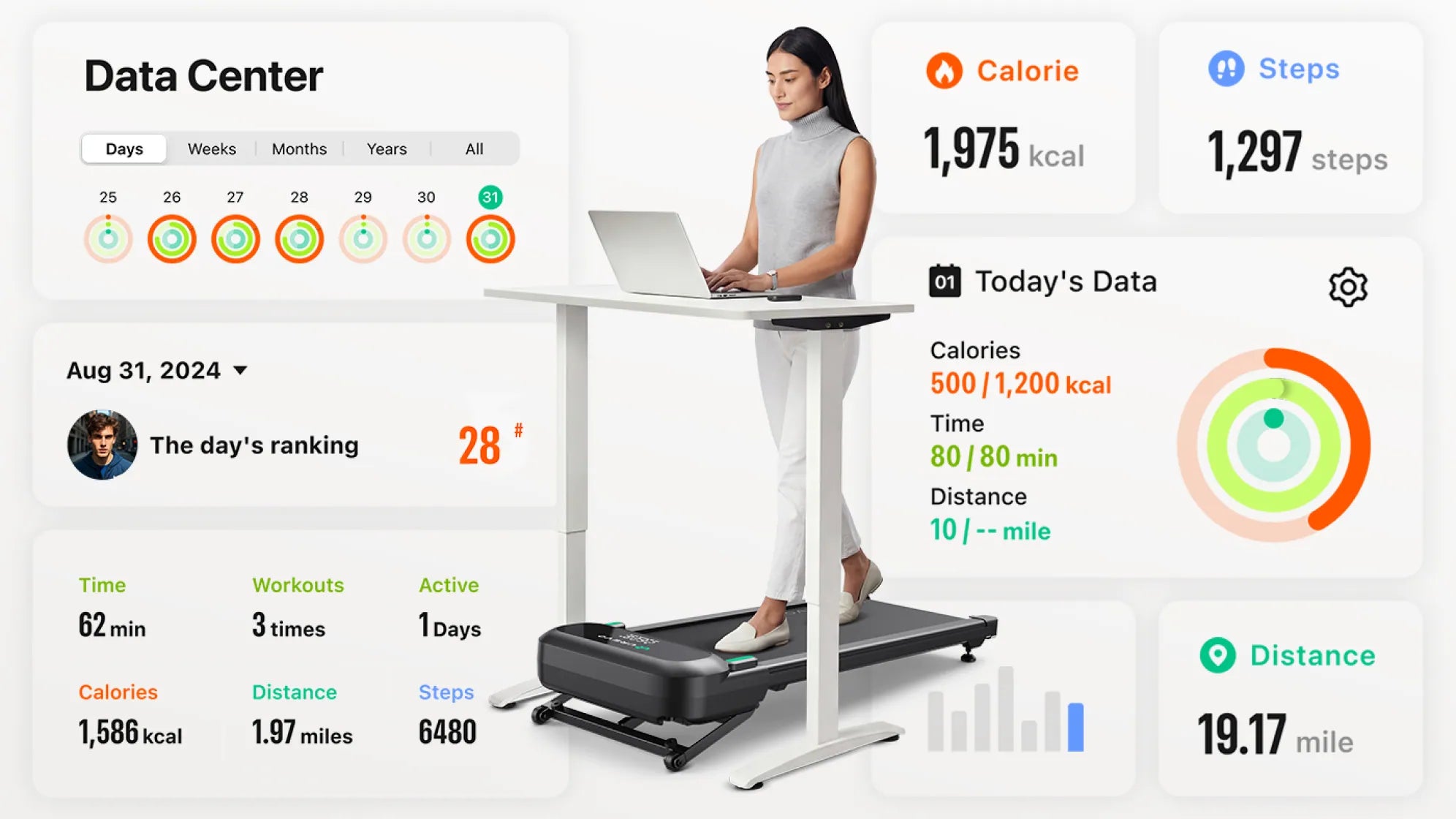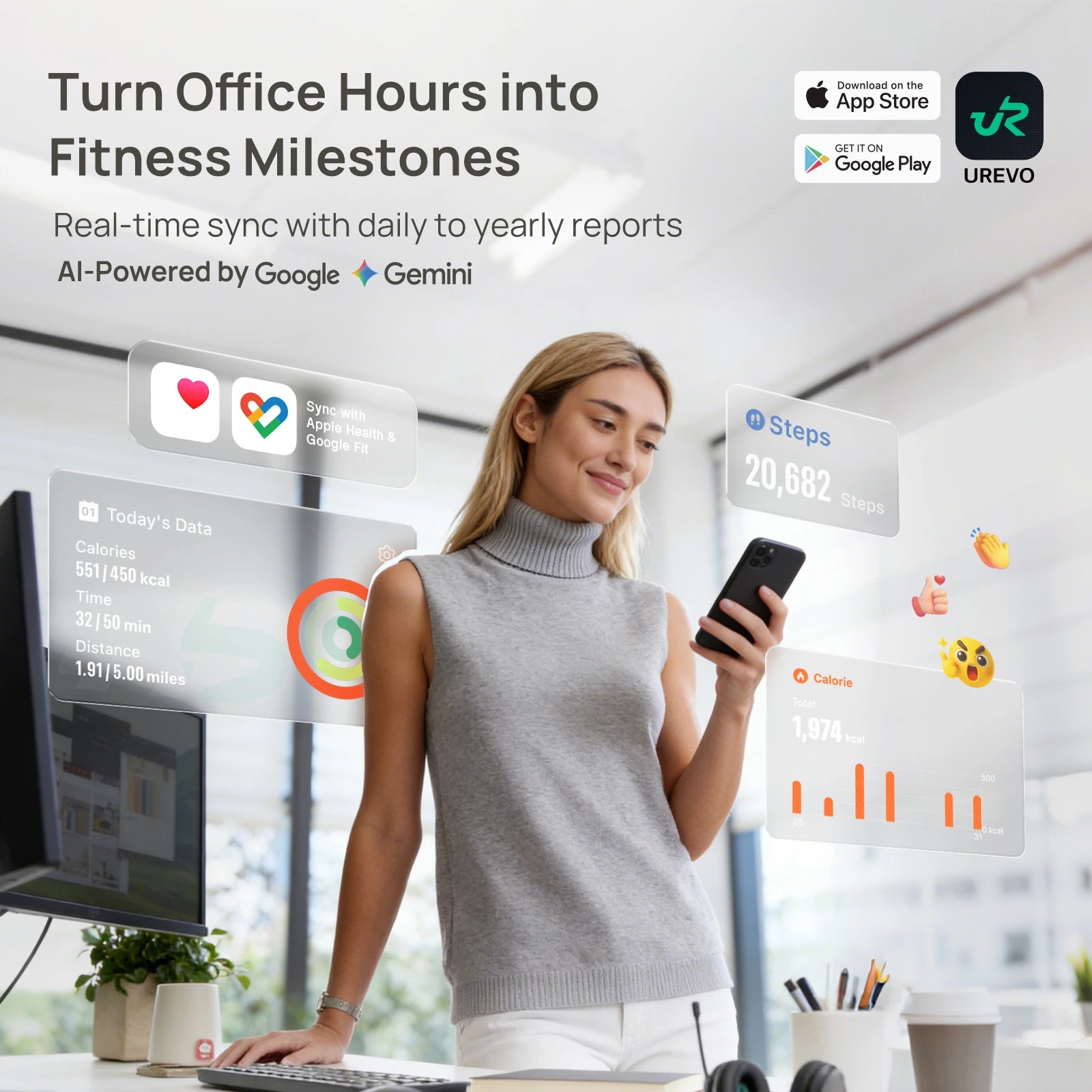 Connect to the UREVO Wellness Hub to track steps, activity, and calories with daily, weekly, and long-term reports. Real-time syncing with Apple Health and Google Fit helps turn every workday into visible, accumulative results.