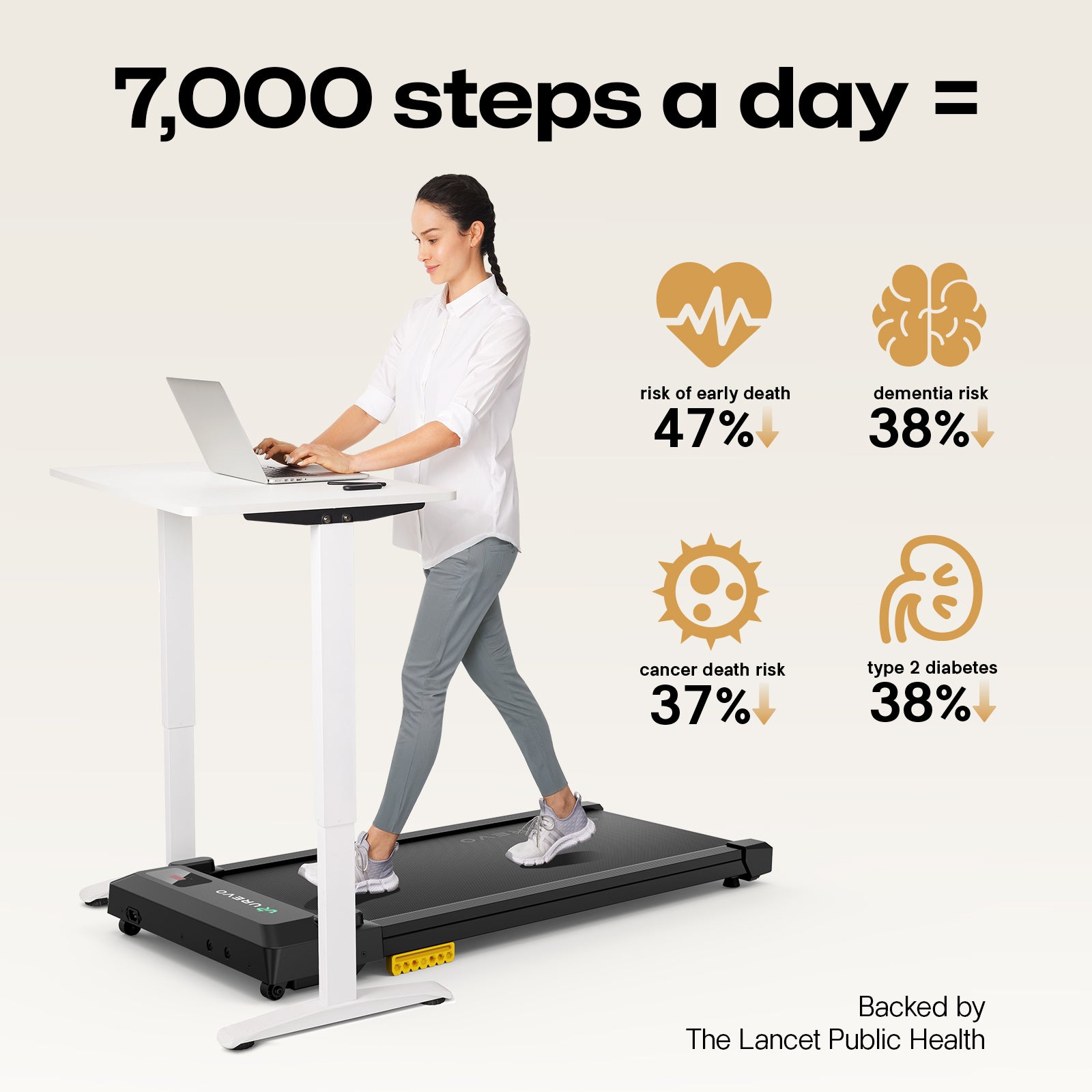 - Double Shock Absorption: UREVO walking pad features a 5-layer running belt, 8 silicone shock absorbers, and 2 soft rubber pads, which effectively protect users' knees, making walking and jogging more comfortable, while also reducing noise.